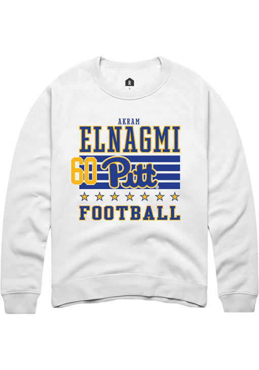 Support your Pitt Panthers and favorite Akram Elnagmi in this Pitt Panthers Mens White Football NIL Striped Player Crew. This Crew Sweatshirt features a NIL graphic, and is sure to stand out in the stadium. Perfect to wear on game day or any day!