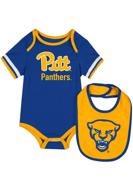 Product Details Product Details Second color sleeve ribThird color sleeve tapingSilver snapsSecondary team color bibComes on a hangerPerfect for any young sports fan!100% COTTONImport, Domestic Officially Licensed Your little Panthers fan will look adorable in this Baby Blue Pitt Panthers The Gift One Piece with Bib! This Pitt Panthers Romper with Bib features a screenprint team graphic.