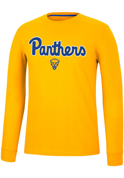 Show your Pitt Panthers spirit in this Panthers Gold T Shirt! This Panthers Spackler Long Sleeve T Shirt makes a great layer for cooler nights cheering on the Panthers. Featuring a screen print team graphic on front chest, this Pitt Panthers Long Sleeve Tee is an essential addition for every fan. Go Panthers!