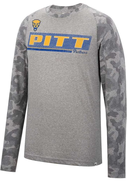 Show your Pitt Panthers spirit in this Panthers Grey T Shirt! This Panthers Quintana Camo Raglan Long Sleeve T Shirt makes a great layer for cooler nights cheering on the Panthers. Featuring a allover camo print with team name on front chest, this Pitt Panthers Long Sleeve Tee is an essential addition for every fan. Go Panthers!