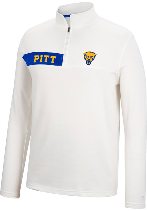 Embrace the warmth and showcase your Panthers pride with our Pitt Panthers Long Sleeve Qtr Zip Pullover. This Mens White Harrington Long Sleeve Pullover offers a rubberized print team logo on left chest with team name in color blocking on right chest for the perfect combination of comfort and style. Elevate your everyday look with this must-have Pitt Panthers Long Sleeve Qtr Zip Pullover.