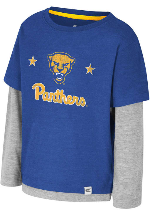 Product Details Product Details Second color neck tapeDistressed washed out printPoly/ cotton blendHeather grey long sleeve w/ team color overlayPerfect for any young sports fan!52% COTTON / 48% POLYESTERImport, Domestic Officially Licensed Style your little Panthers fan in this Blue Pitt Panthers Long Sleeve T-Shirt. This Investigatory T-Shirt features a distressed screen print.