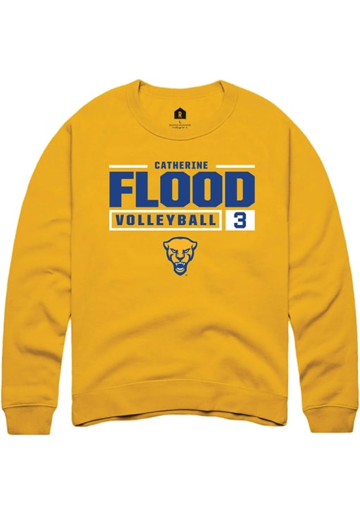 Catherine Flood Rally Mens Gold Pitt Panthers NIL Stacked Box Crew Sweatshirt