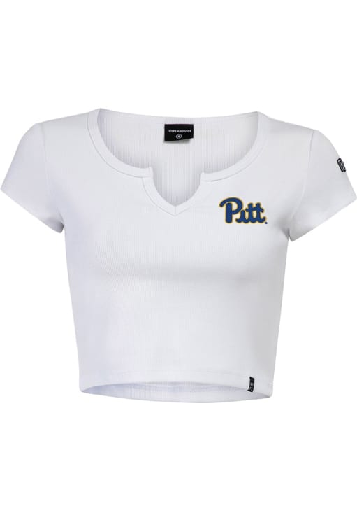 Display your team spirit with this remarkable Pitt Panthers White Cali Crop Short Sleeve T-Shirt! The Panthers Short Sleeve Tee showcases a embroidered team logo on left chest that truly sets it apart. Stand out from the crowd and proudly declare your allegiance to the Panthers with this exceptional White Panthers T-Shirt. Go Panthers!
