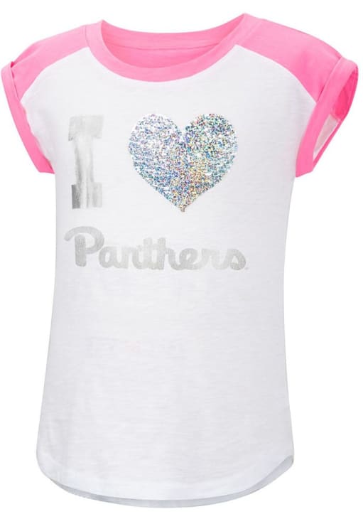 Show your support for Panthers in this Girls White Pitt Panthers Short Sleeve Fashion Tee! This Team Fashion T-Shirt features a go panthers that pairs perfect with any wardrobe. Get ready to show pride for your favorite team as you cheer "Go Panthers"