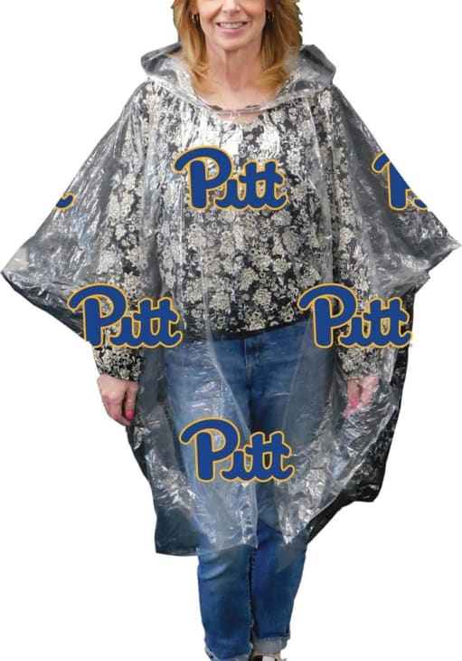 Product Details Product Details Large 52" x 86" coverageTeam colors and graphicsAll over step and repeat printRoomy hood with drawstringOne size fits most adults!PLASTIC Officially Licensed The rain is never a problem for a Panthers fan when you have this Pitt Panthers Mascot Poncho. This Poncho features a team logo.