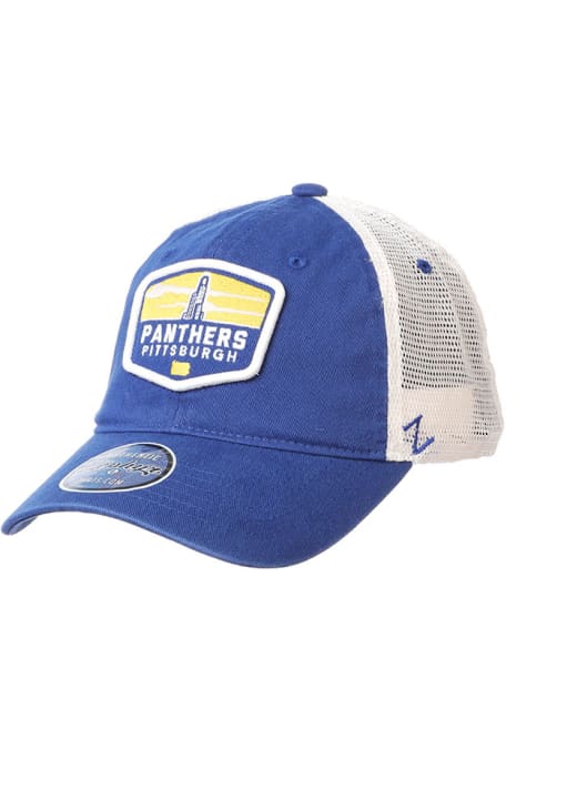 Product Details Product Details Zephyr Outlook MeshbackFront team patch appliqueTeam color crown and visorBack soft poly meshSide Z logoCotton/Poly BlendCurved BillLow CrownUnstructuredWipe clean with cloth or cleaning kitImported Officially Licensed This Blue Panthers Adjustable Hat features a front embroidered team logo.