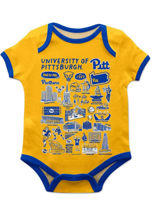 Your little Panthers fan will look adorable in this Baby Gold Pitt Panthers Impressions One Piece! This Pitt Panthers Romper features a hand sketched artwork perfect to keep the new fan cheering for your favorite team.